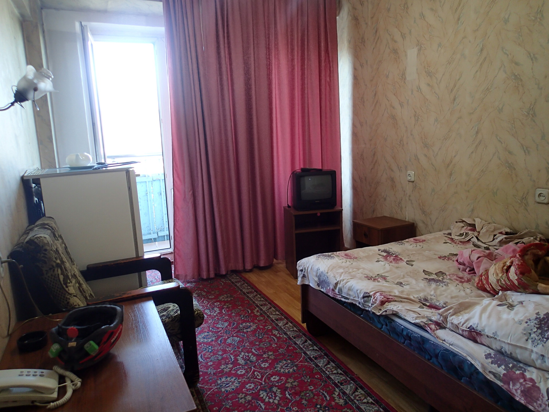 原來那姊姊已經幫我連絡好旅館了。房間是在九樓,當我從九樓眺望阿拉木圖市區時,對於在這個空間、地點的我卻有種奇妙的感覺。我竟然有這個機會在這裡!我在半個小時前,連今天要在哪落腳都不知道,現在竟連住宿都不用煩惱了,還住在這麼一個很不錯的地方!