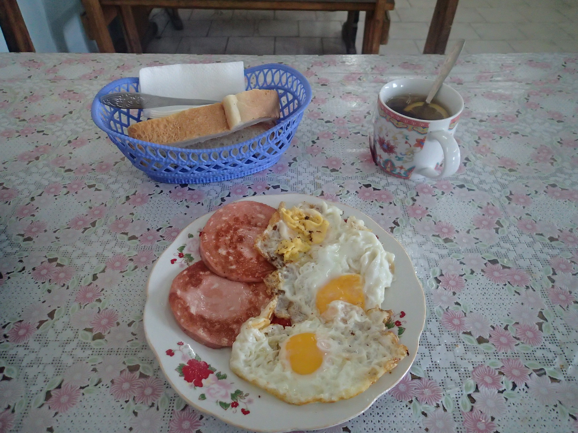 因為昨天在餐廳門口搭帳篷,今早六點多就被門口兩個司機的聊天聲吵醒,知道他們在好奇著出現在這的單車和帳篷,不想出去。一直等到都沒聲音了才掀開帳篷走出去,先到餐廳裡用水刷牙洗臉,和餐廳裡的姊姊點了早餐後,便趁著他們在做早餐時把帳篷收拾好。進到餐廳後發現,餐廳裡的長椅併在一起後就是餐廳裡的姊姊們睡覺的地方,進去時還有兩個姊姊在椅子上熟睡著。