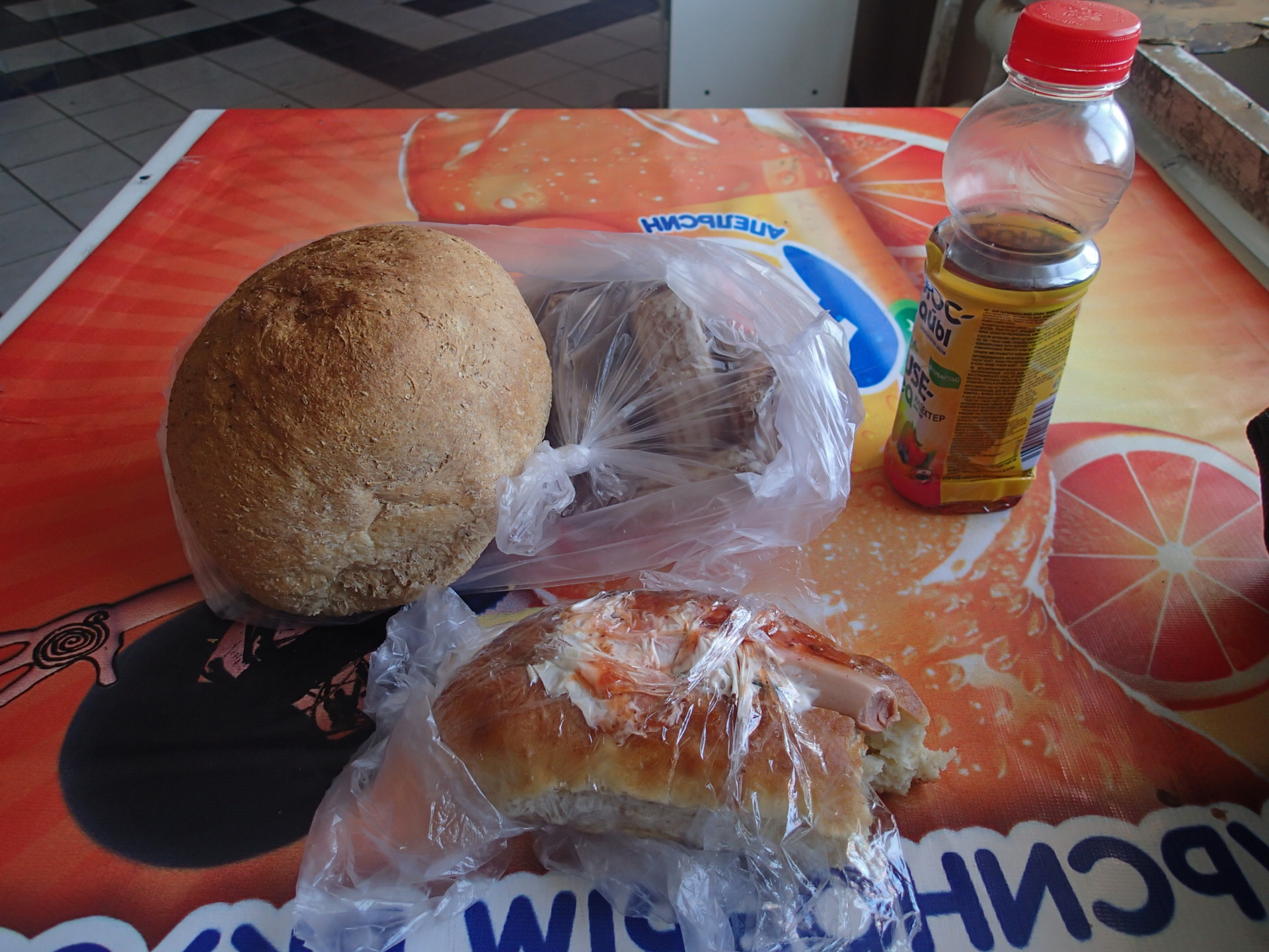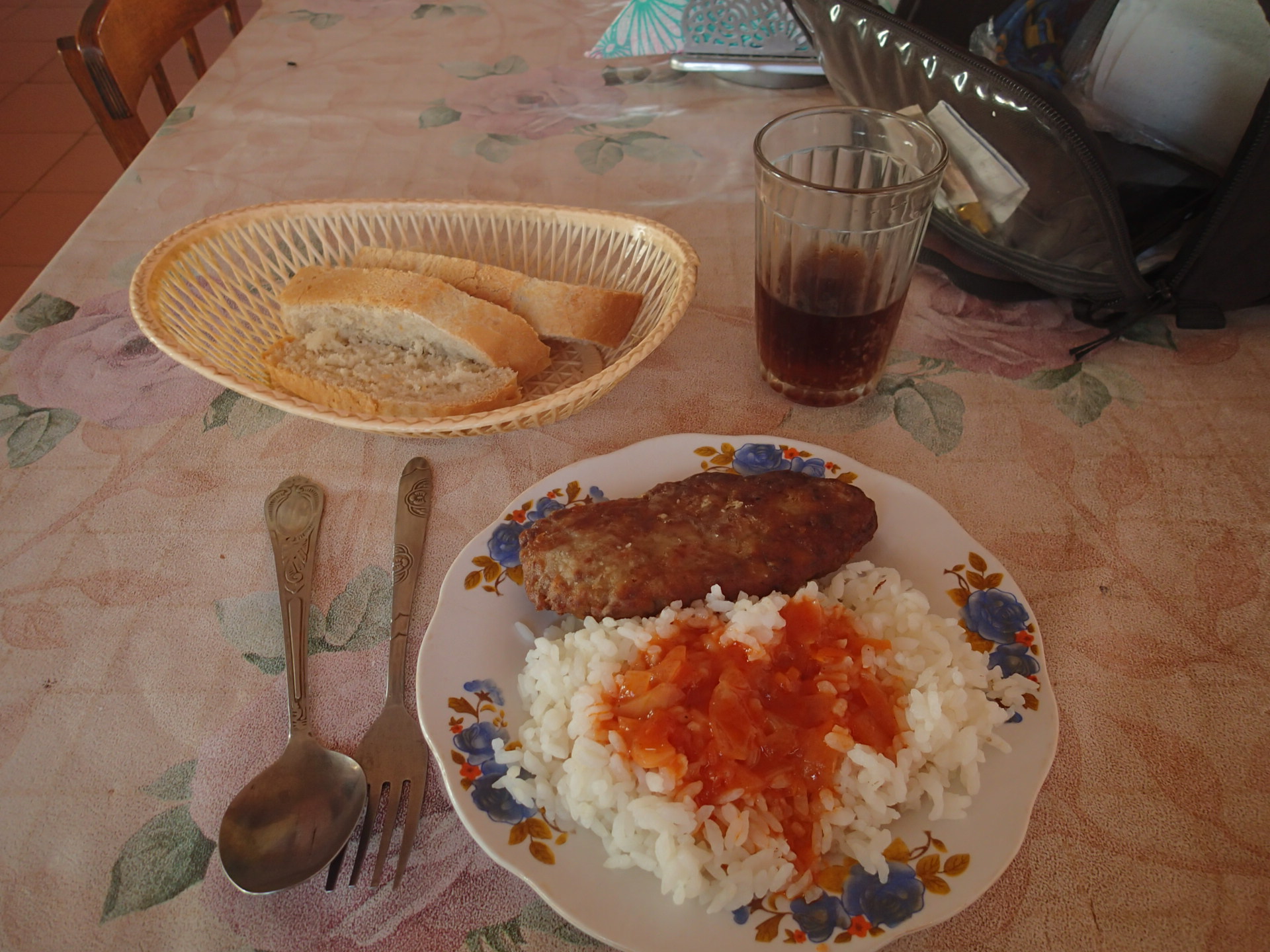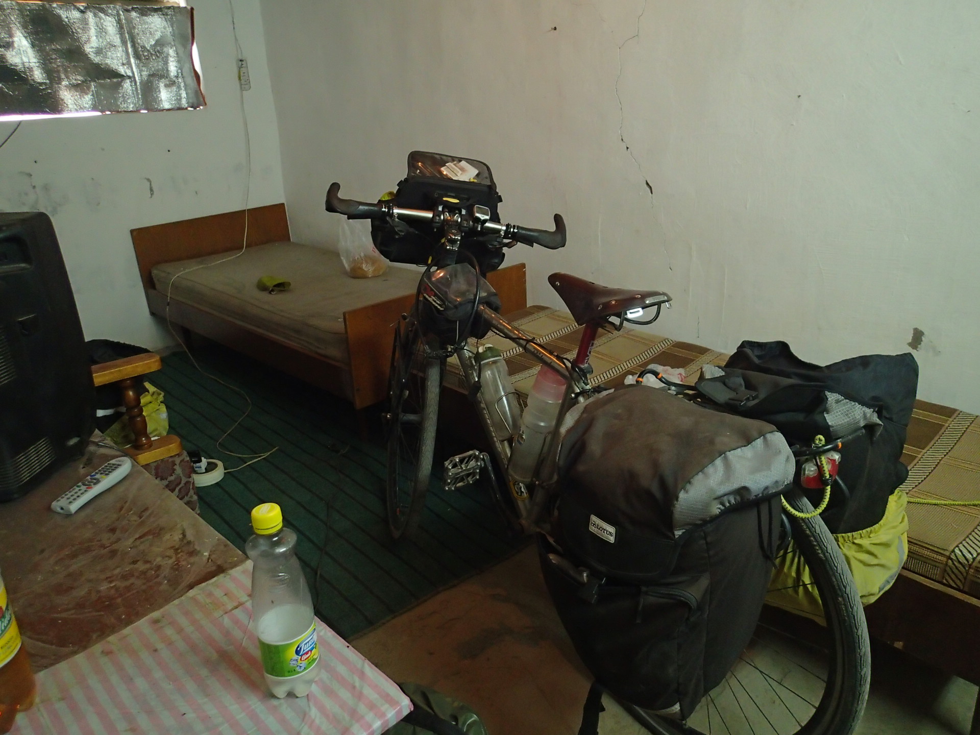 把單車牽進小房間後,大叔叫我上樓吃飯。樓上正是經營餐廳的,他叫他老婆給了我一杯格瓦斯(愛死這味了!),見我聽不懂,直接拿出了冰箱裡的雞腿和漢堡肉讓我選。餐點送上,看到她女兒和老婆都收拾好了,就是在等著我,我趕緊三口併作兩口的吃完盤內食物,把吃不完的麵包放到包裡。原來他們一家人並不住在著,餐廳關門後,他們就駕車回家了。所以入夜後這裡就只剩下我一個人了。
