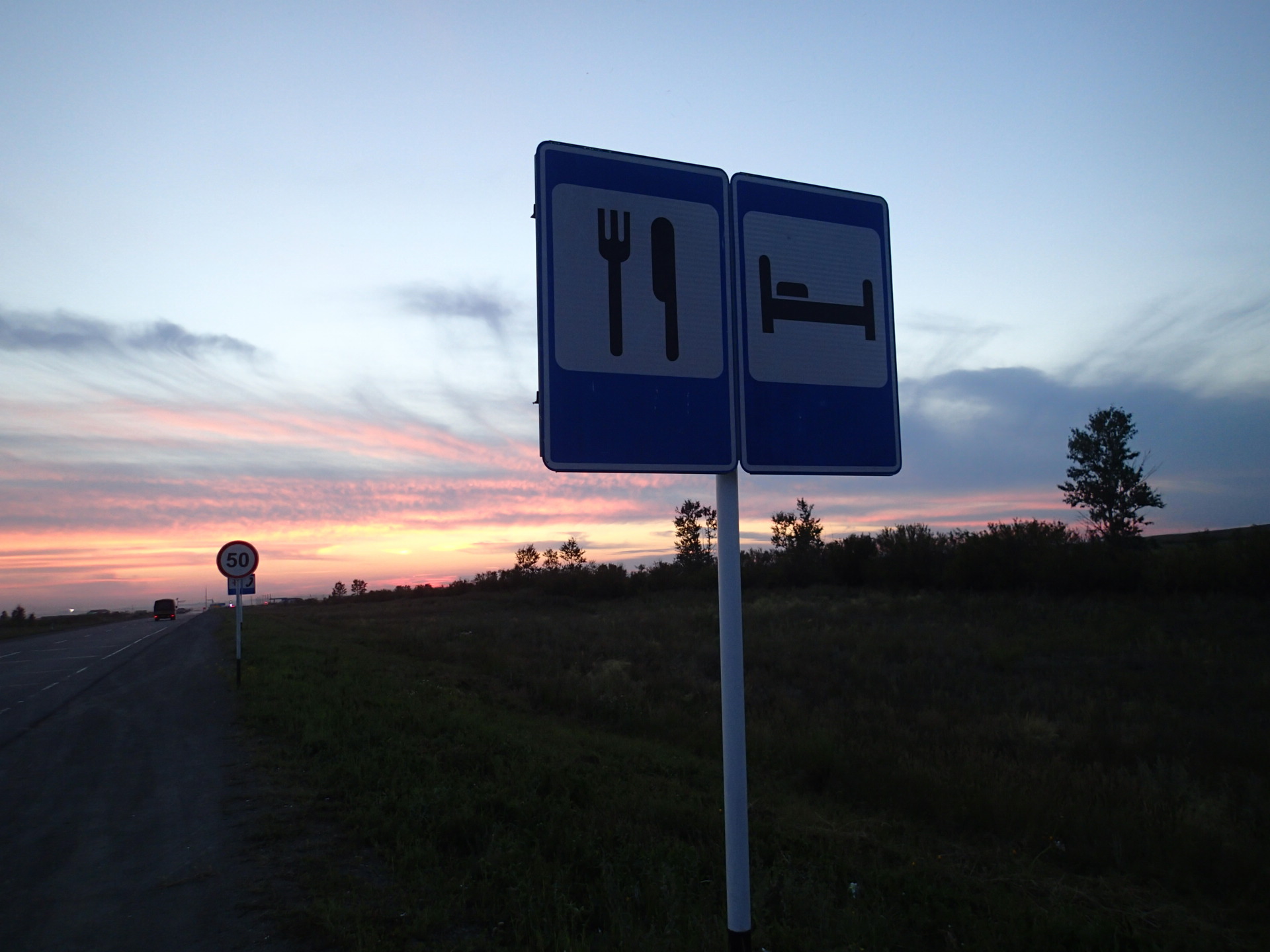 快晚上時,終於終於看到了餐廳和旅店,這是一家不小的餐廳,外頭停了三、四十台大卡車,二十四小時營業、裡頭竟有乾淨的坐式馬桶(別怪我大驚小怪,進到哈薩克後,坐到作式馬桶的機會,五支手指頭數的出來,大部分都只是挖個洞),天晚了,還得找地方露營,要不貞小在這好好吃頓飯。買了些餡餅和飲料後,又把空了得水瓶,拿到廁所的洗手台去裝水,打算拿來做梳洗用。一個從我進到這餐廳後,就一直盯著我看的司機,看我用水瓶裝了洗手台的水後,連忙湊過來比手畫腳地跟我說,這洗手台的不能喝,只能用來洗手。我說我知道,我沒有要喝,不過還是謝謝他。