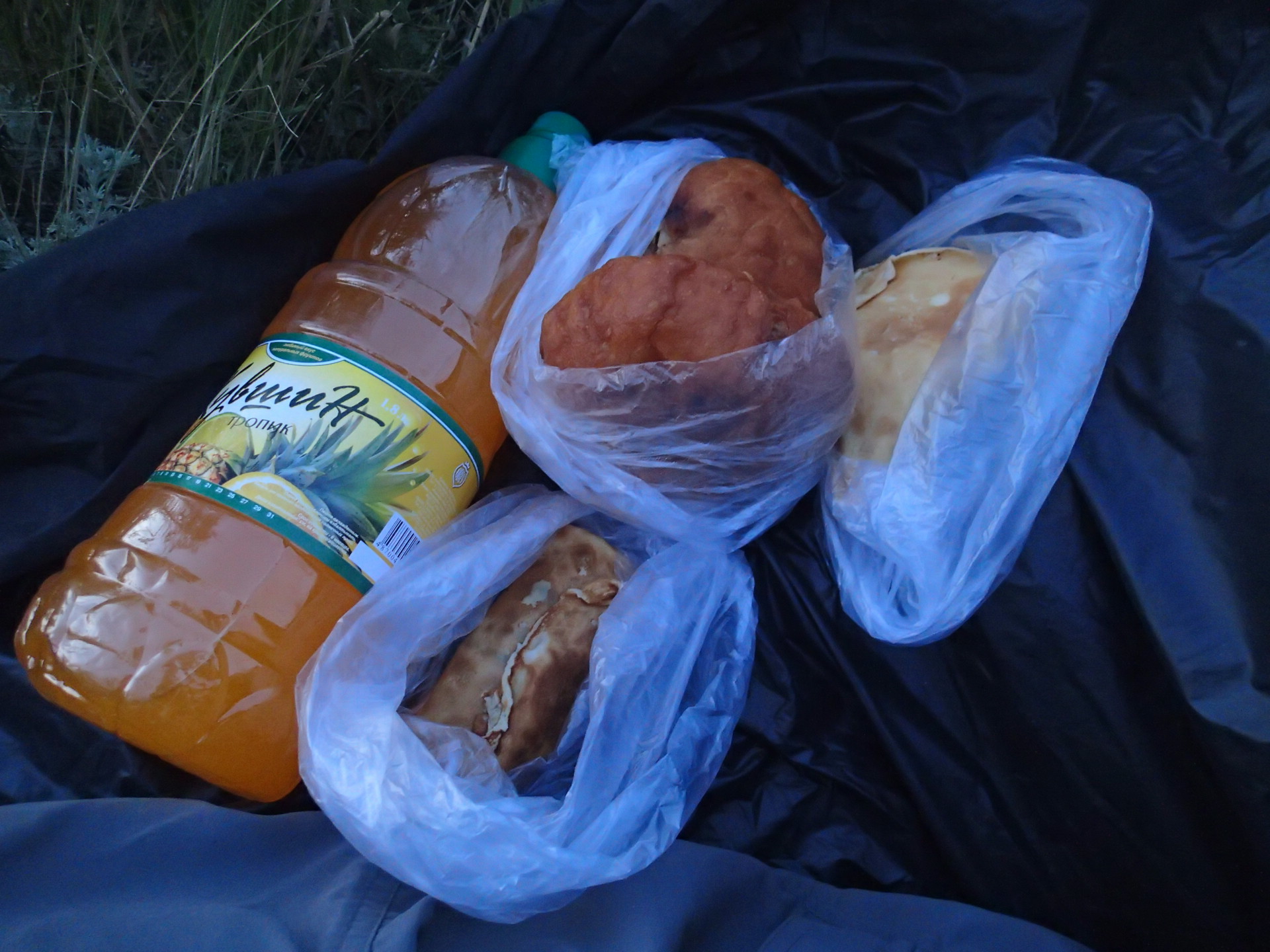 拿出防蚊噴霧往自己的手、腳和空氣中猛按幾下,拿出防潮墊往地上一放、坐下,又拿出剛買的食物,先吃東西先吧!早上吃了蛋糕捲後就沒再吃東西了。
