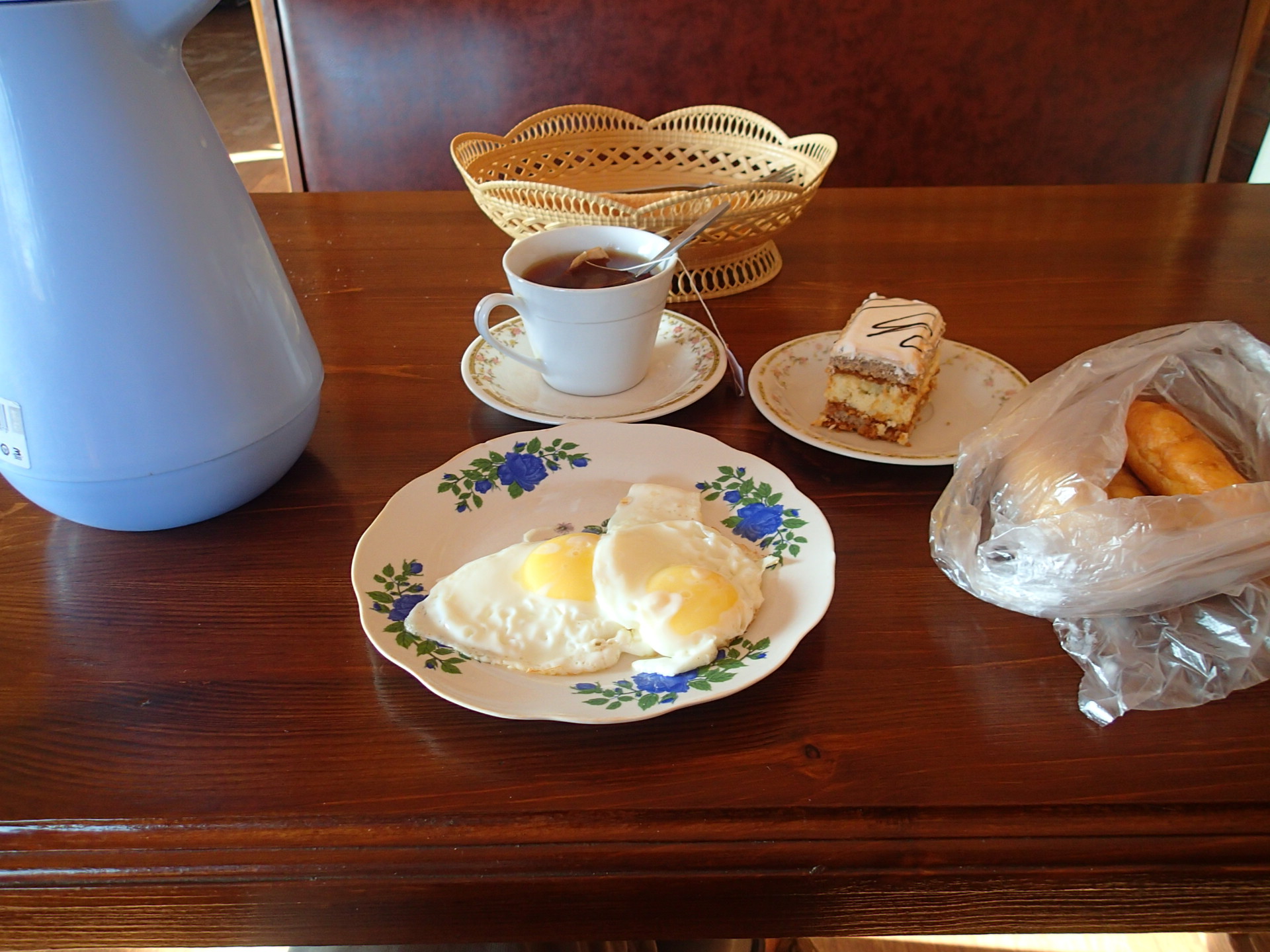 六點多就起床了,出去小解,太陽還沒完全出來,還有點冷。收拾好後,又向前騎去了昨天買食物的那家餐廳,櫃台姊姊從昨晚到現在依舊是同一個人(上班時間也太長了吧)。點了玻璃櫥窗裡的小蛋糕、煎雞蛋和茶,便揀個位子坐下。餐體裡的多是一人或兩人的卡車司機黨,這餐廳外頭有一大片空第,至少停了三十輛以上的大卡車,看到幾個司機穿著拖鞋、短褲,手拿毛巾、牙刷,看來昨玩是睡在自己的車哩,他們先在餐聽裡點了餐,便到了一旁的廁所去梳洗。