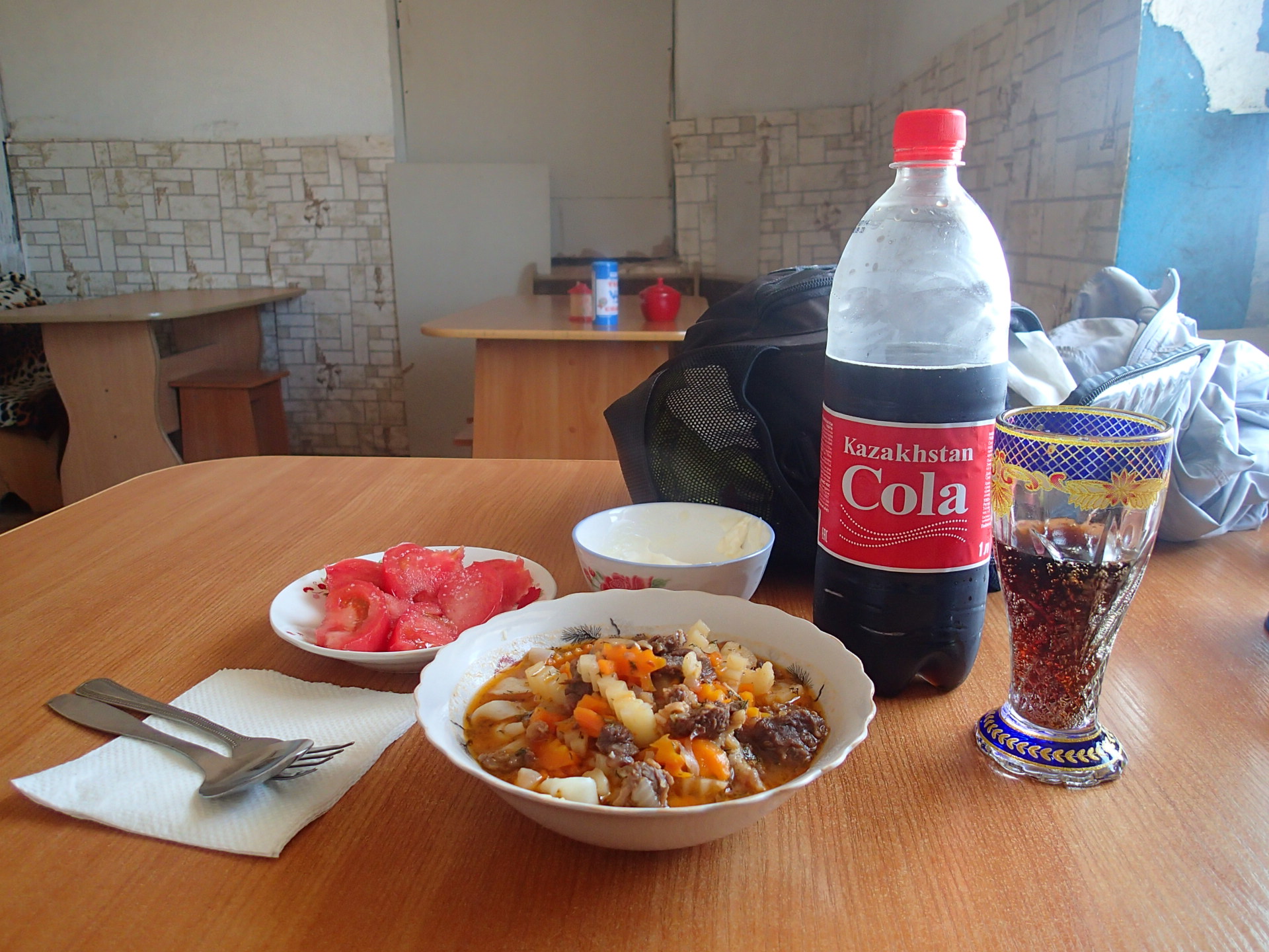 他又回廚房裡後,我突然感覺我是不是被當凱子!一小盤番茄和可樂要六百五十Tenge實在是貴了!不過,想說錢都付了,也就算了。下次要先問清楚再付錢。