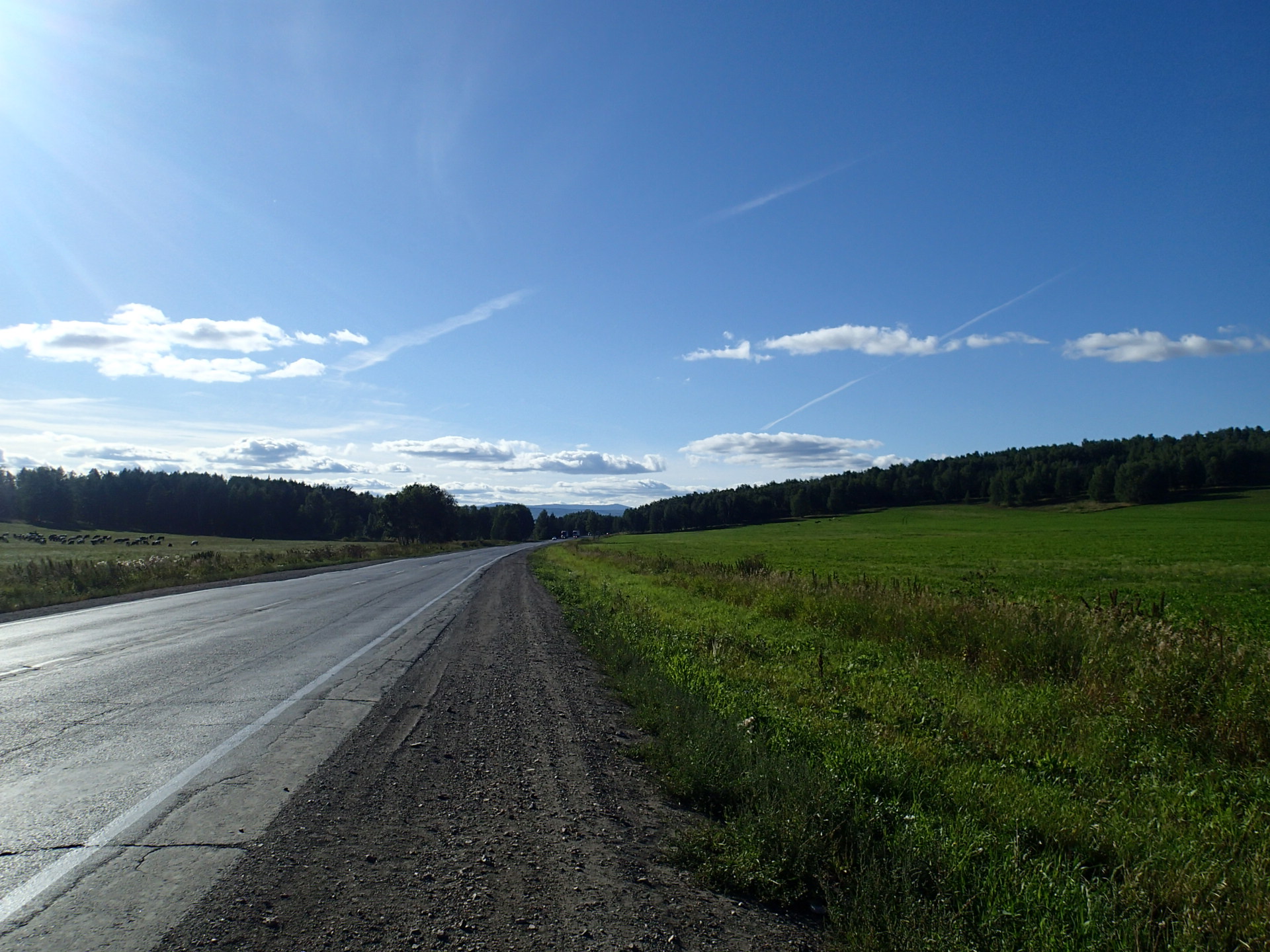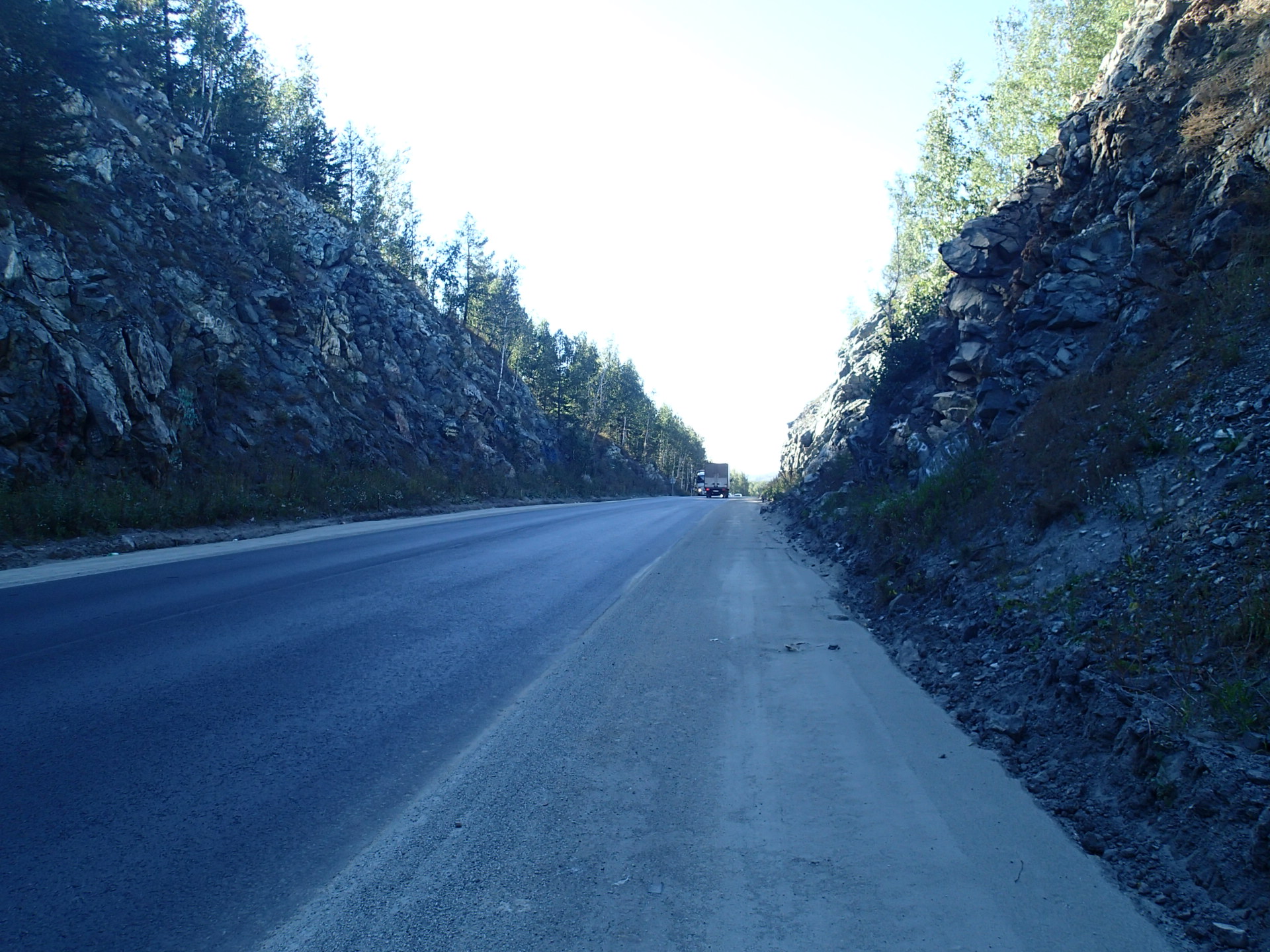 一早就碰上連續十公里的修路,雙向都只有單線道,而且沒有路肩!柏油路旁邊就是石子路,很多時候都是走在石子路上,有些沙子石子堆的挺厚的,會滑。一不注意,就摔車了,膝蓋直接撞到地面,那時車道上車子來來往往,實在不想弄得自己很可憐,馬上爬起來,扶起車,往前騎。但一直聽到後輪有ㄍㄧㄍㄚ聲,騎了段路還持續著,下車一看,原來是馬鞍包鬆脫,摩擦到後輪,只能把車往旁邊牽,把馬鞍包固定。弄好了,但也不想走了。把車牽到施工的土堆後頭,吃起餅乾,把車褲拉起,還好膝蓋看起來只是擦傷,倒點藥水消毒應就沒事。