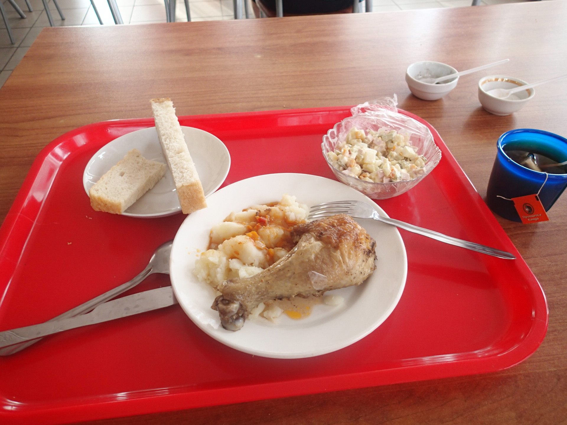 到了附設的餐廳吃早餐,這次看著菜單指到的是一隻炸雞腿和沙拉,似乎這是這次出來第一次吃到雞腿,真是富含蛋白質的一餐,心想吃了這餐能騎很久了。