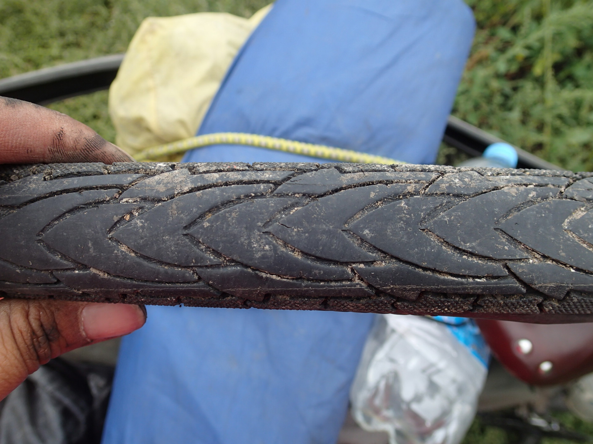 換下來的外胎,沒打算丟掉,有點捨不得,但也知道帶著也完全用不上了,還不知道怎麼處理,先帶著吧!