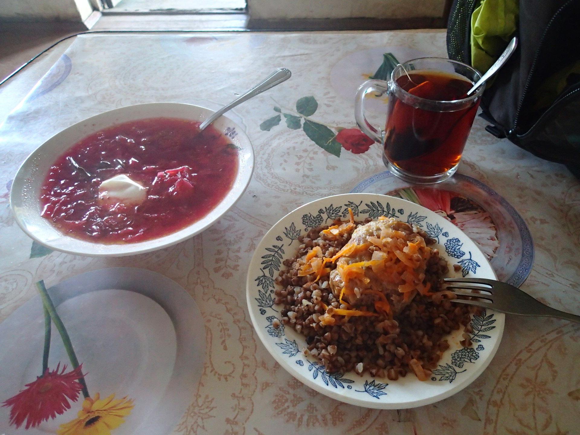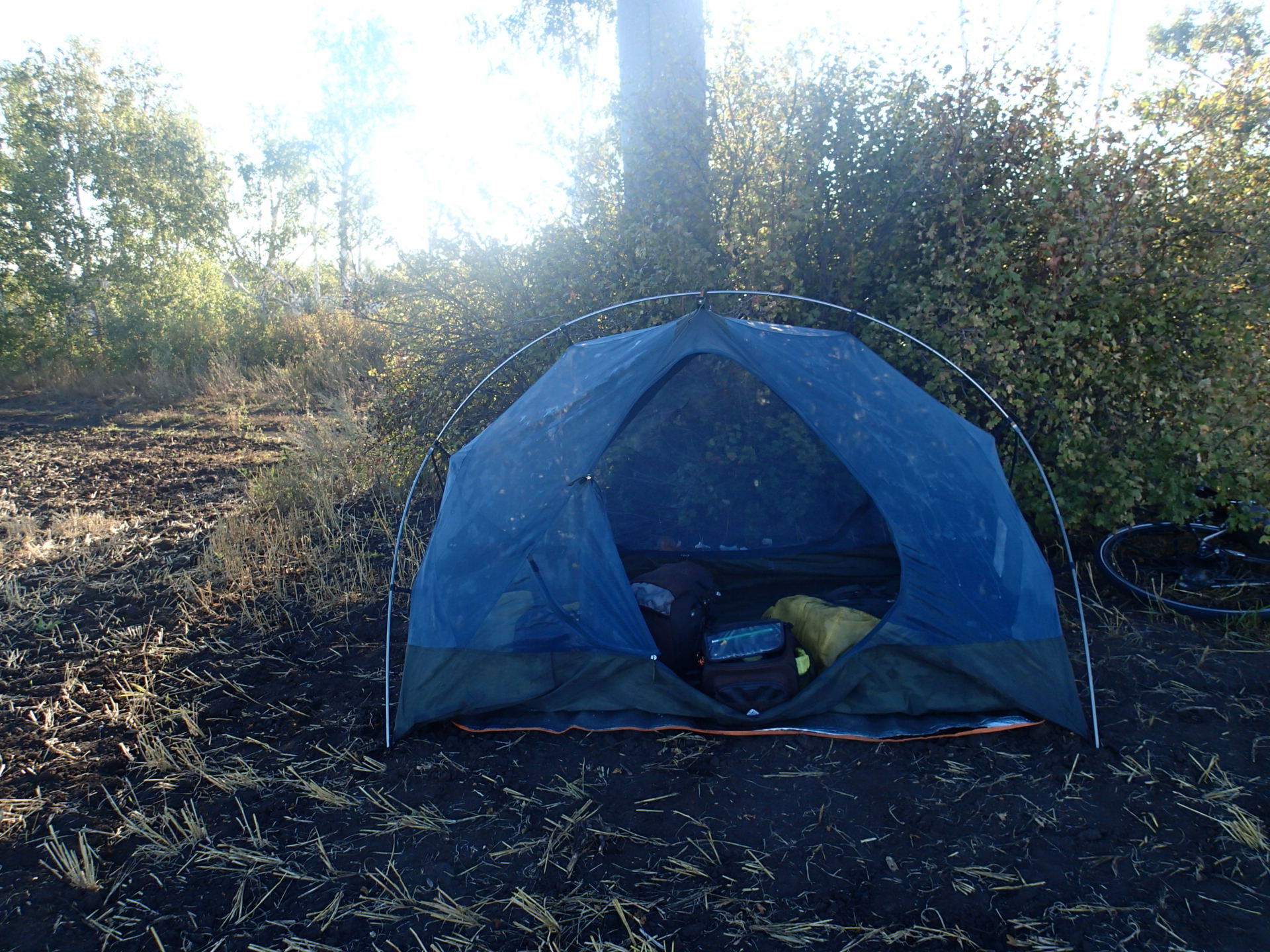 有個男生朝我走來,是好奇吧。我簡單的跟他說我從那裡來,要往莫斯科騎去。雞同鴨講了會兒,他要我把水瓶給他,要幫我把水灌滿。原來是修車廠的學徒,他要我進去休息,我便跟了進去喝茶、吃餅乾。可能是因為知道我大概露營好幾天了,還問我需不需要洗澡。其實剛剛已經在想頭皮開始癢了(是非常癢),明天要找個有水龍頭的地方洗頭。所以當他們這樣問時,我當然想啊,但考慮到這裡就兩個男生,其實是顧忌、會害怕的,便只是和他們借了洗手臺,把臉和頭髮洗了,有熱水已經很滿足了。他們甚至說我可以在這過夜,房間裡有張簡便的躺椅,我相信他們是好人,但我不想一整晚的提心掉膽,儘管那時天色已暗,還是決定繼續往前騎找地方搭帳篷。