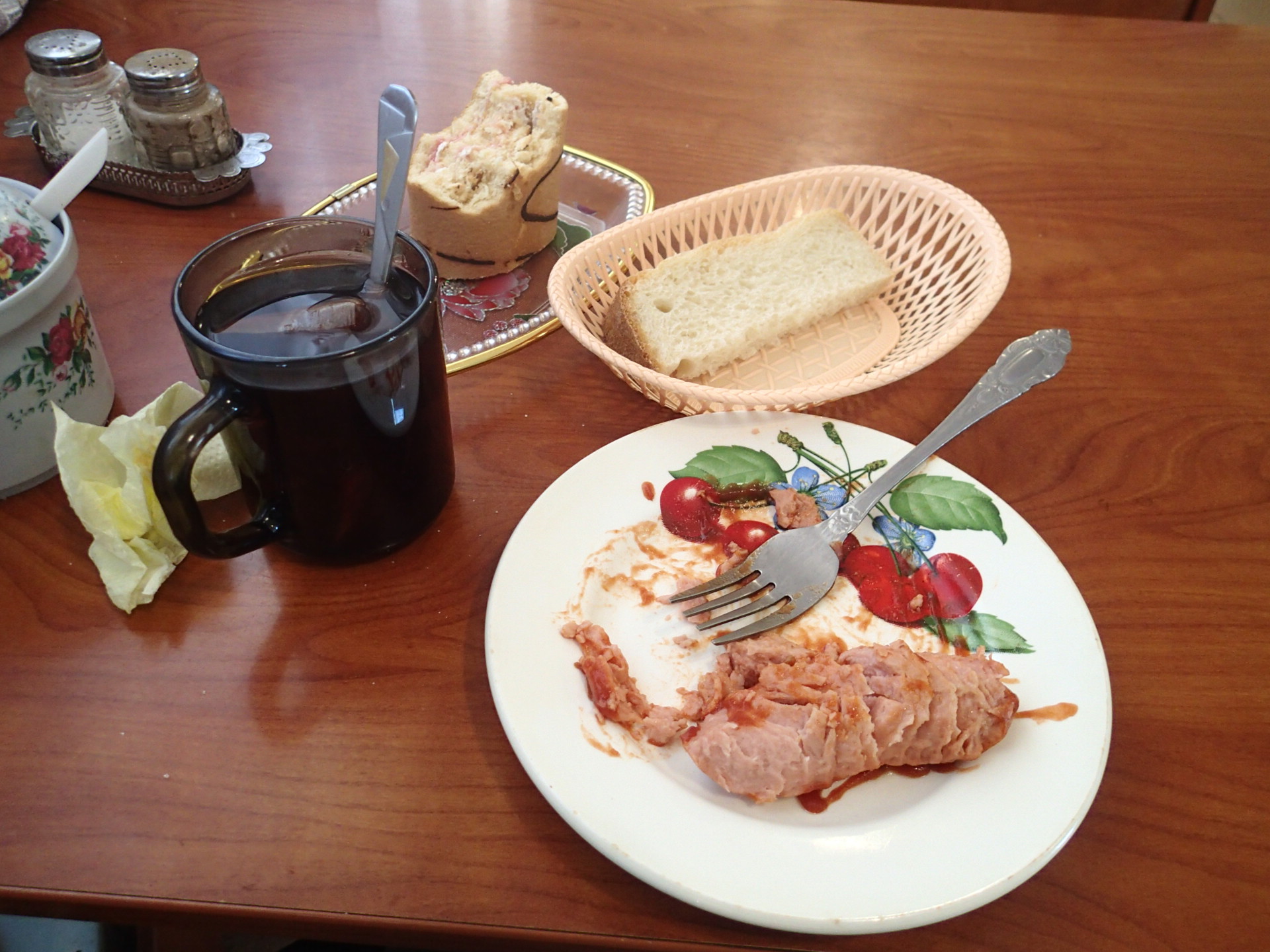 今日早午餐。右下角的小塊火腿竟然要50盧布。櫃檯的老先生看我點火腿(實際上,點餐時我並不知道我點了什麼,只是看到50盧布的東西,想說這價錢應該是個介於正餐和點心之間的東西吧(EX餡餅、雞蛋)),又免費送了我一片麵包讓我配著吃。