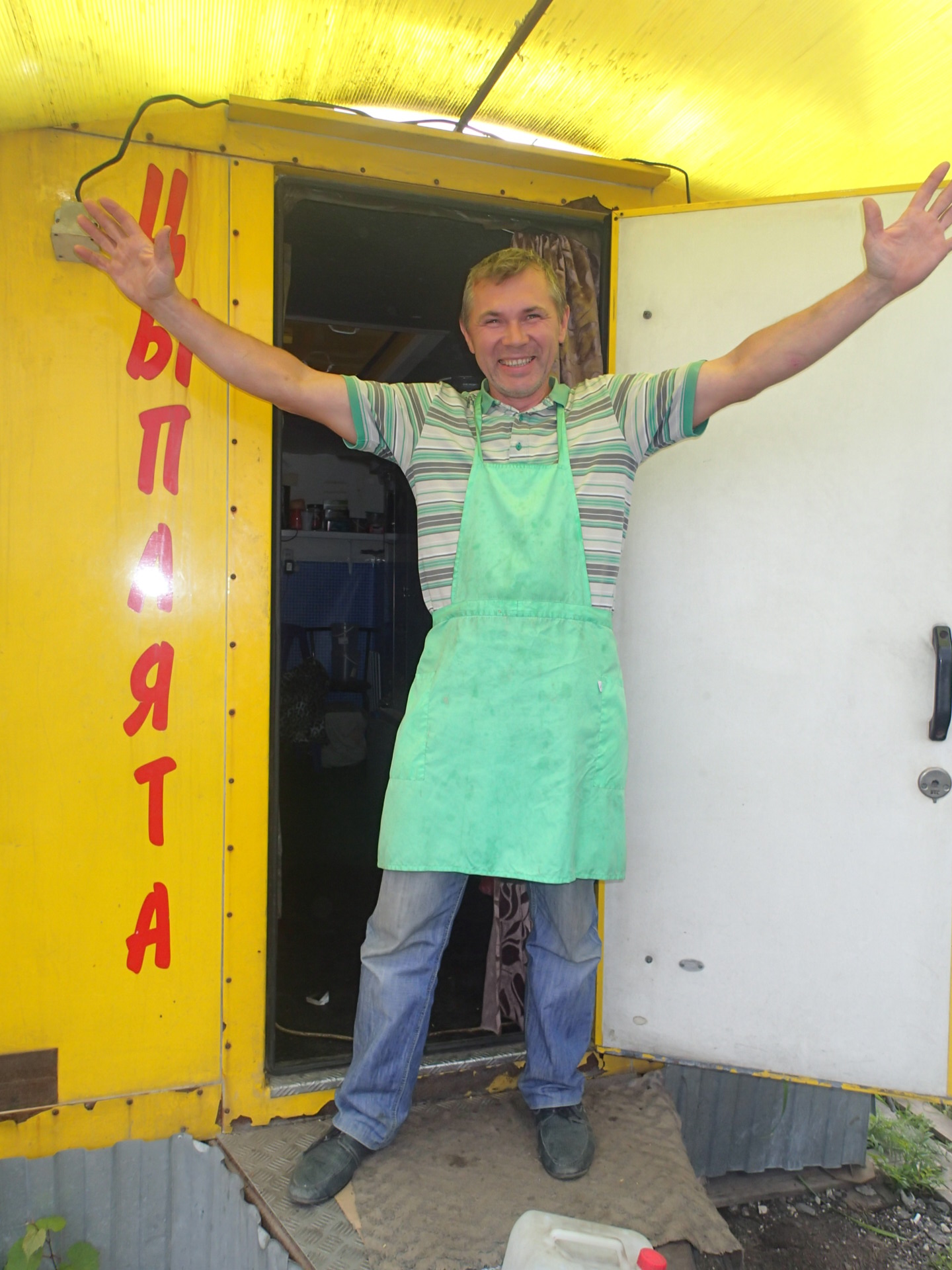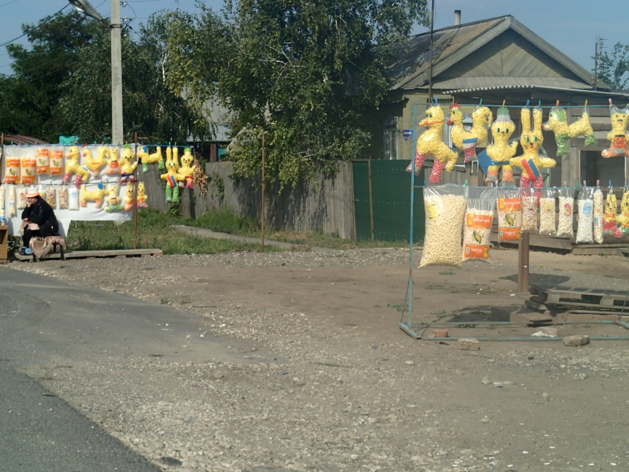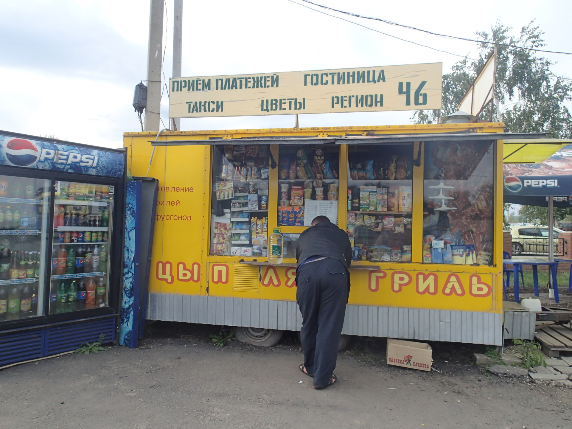 下午兩點時,到了Krasnoselsk的邊邊,又進入了另一個州,道路兩旁,一整排都是餐廳,每家店前炭都擺著烤肉爐,只見老闆娘們不時的出來翻動火,讓火爐持續地冒出百煙,招攬生意。在其中一家店前停下,問了站在外頭的老闆娘這附近有無銀行,老闆娘說得往回走到鎮裡面才有。還要往回走啊!算了吧,我剛才可是爬了長波才到這裡的。立馬打消了在這領錢的念頭。