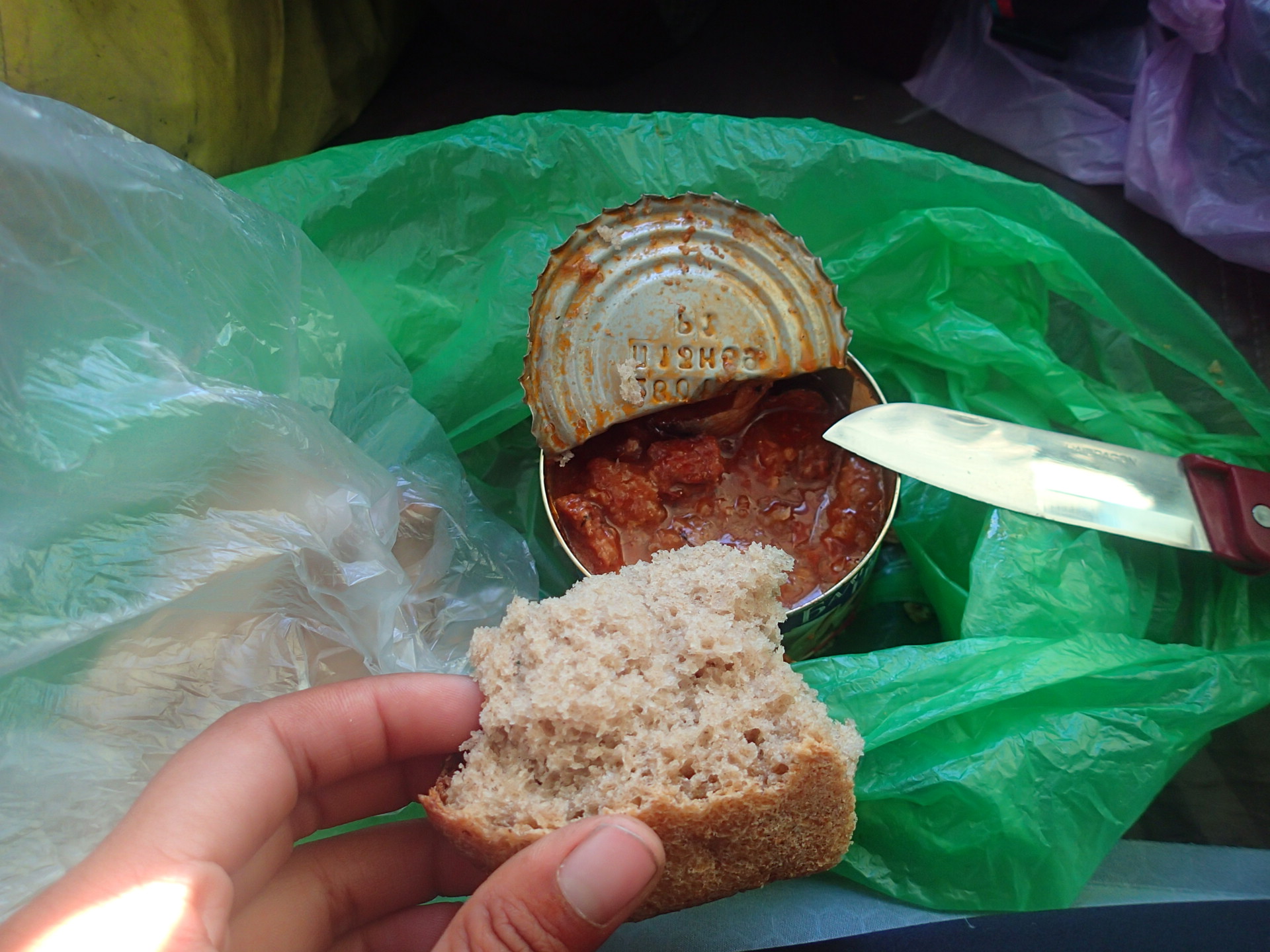 四個餡餅+兩條Mars144,水+麵包57,果汁+蛋糕卷+衛生紙+魚罐頭+豆豆罐頭149