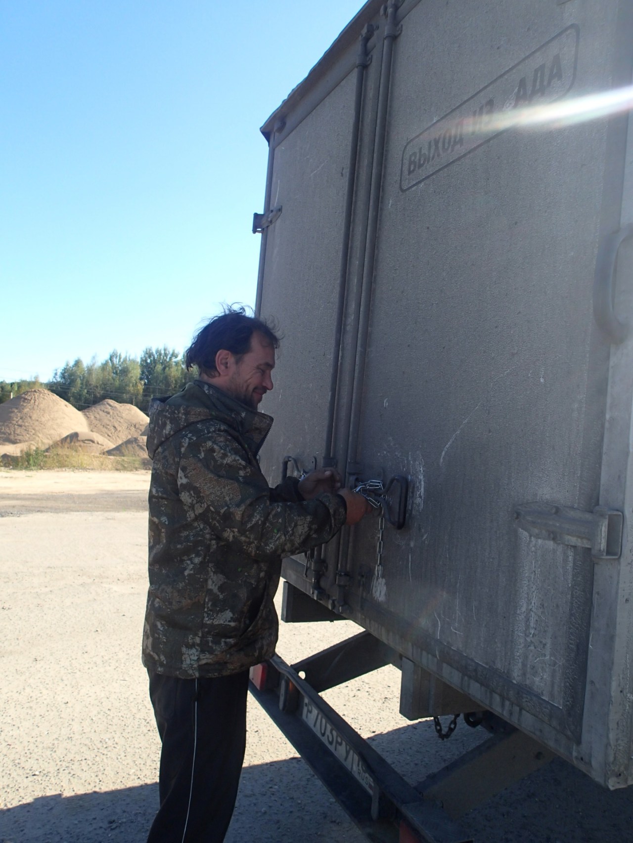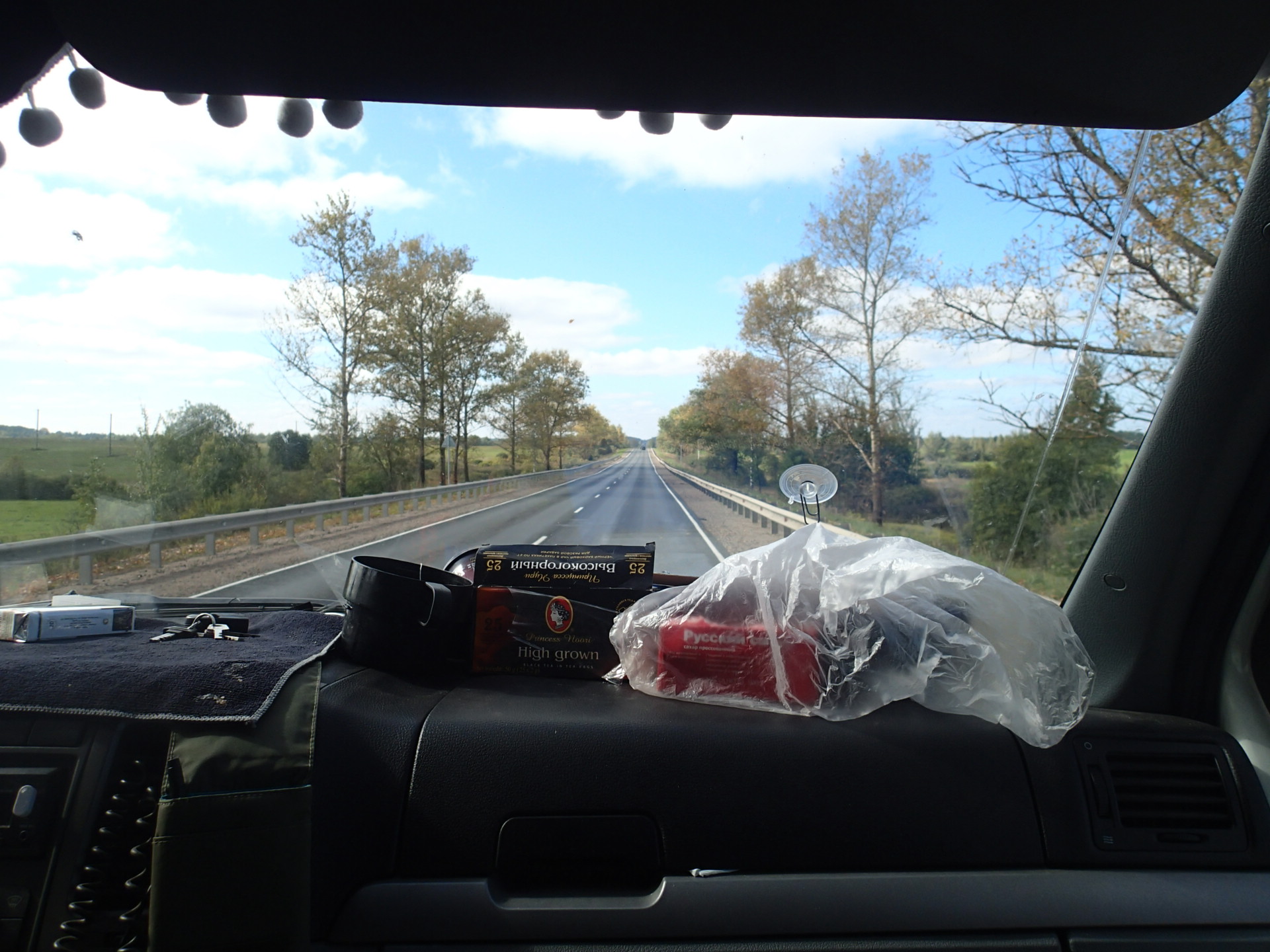 我這方向經過的車子不多,看到大卡車經過便向車道舉起大姆指(搭便車的意思), 就這樣半小時過去,司機們多是好奇的,或者說感到有趣地直盯著我看,但絲毫沒有減速的意思,就是開了過去。再過了二十分鐘,還是沒有車停下來。決定繼續往下騎。一點半,在一公車亭前五十公尺停下,沒時間了,這次不論什麼車,小客車、休旅車,也不管載不載的下我的單車,我對經過的所有車輛都舉起大姆指。兩點時,終於有輛小貨車在我身後停下,他可以順路載我一百公里,一百公里後他就要右轉往聖彼得堡去。上車後,聊了幾句,原來他正在開車環俄羅斯,今天已是出門的第五十三天了!在搭便車前,就想說會停下來的,大概也是有戶外或旅遊經驗的人,沒想到就這麼讓我遇到了個有趣的人。但因為語言實在不通,在車上大部分時間還是沉默居多。