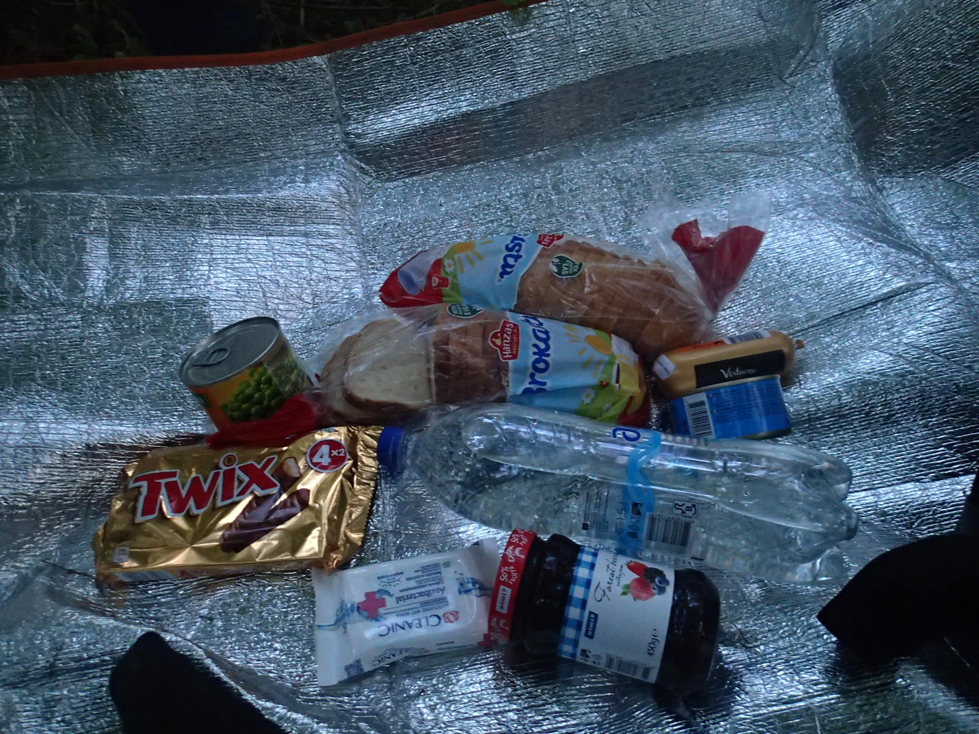 水+濕紙巾+Twix巧克力棒*4+麵包*2+綜合果醬+肉醬+魚罐頭+優酪乳