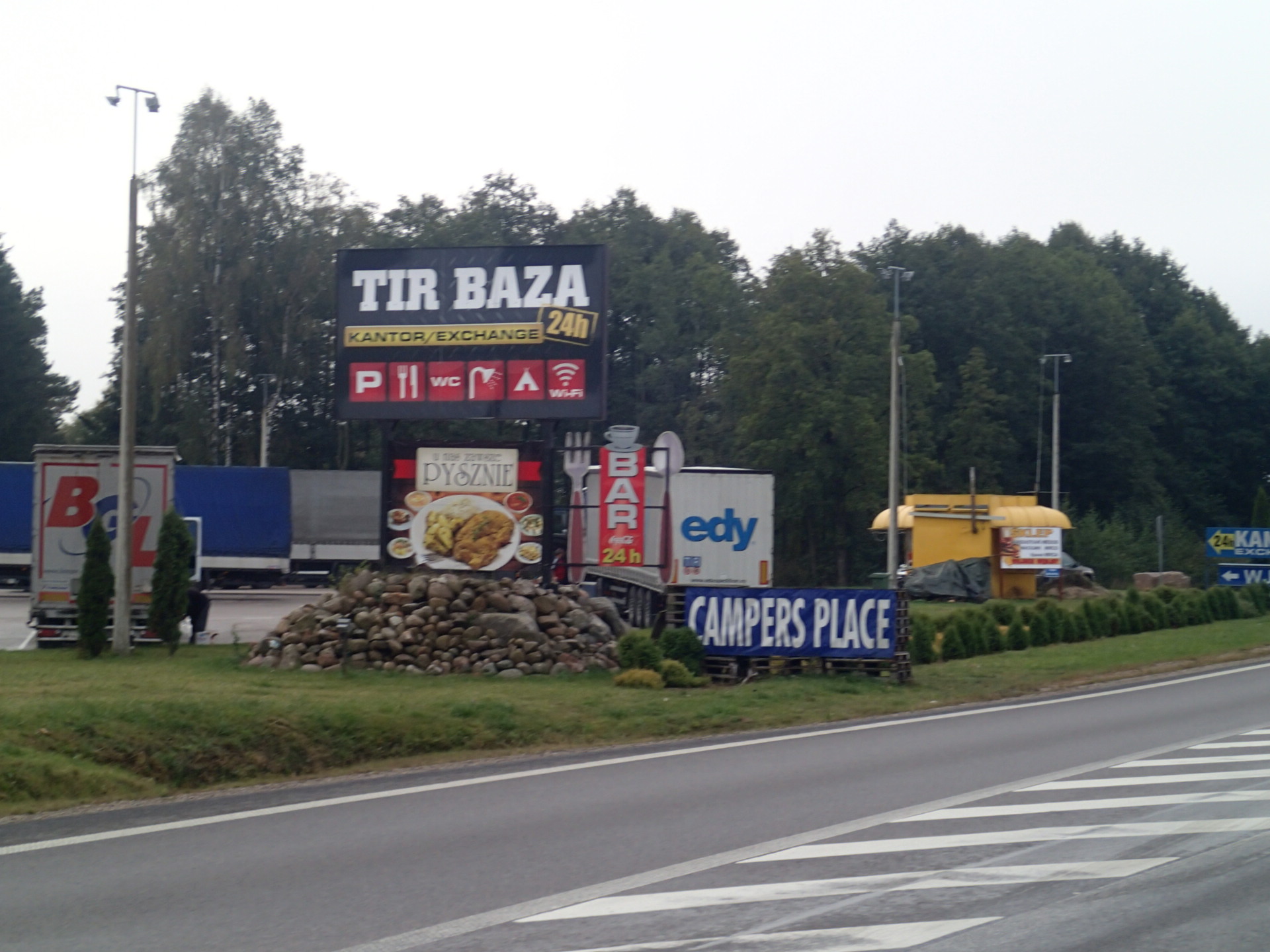 進波蘭後的這條路,沿路都有hotel,bar供貨車司機休息,且他們的門口都有「kantor」的招牌,是24小時提供兌換錢幣的服務。也是看了這種店門口跑馬燈的時間顯示,才發現原來時間又慢了一個小時。一進Szypliszki,就看到了提款機的指示牌,事先沒有先查匯率,點了顯示的領款金額的中間值,先領300吧!離開了提款機,馬上就蹭到了wifi,原來茲羅提對台幣是一比九點多,那可簡單了,以後看到波蘭商品的價格顯示,只要把小數點往後移一位就大概是台幣的價錢了。