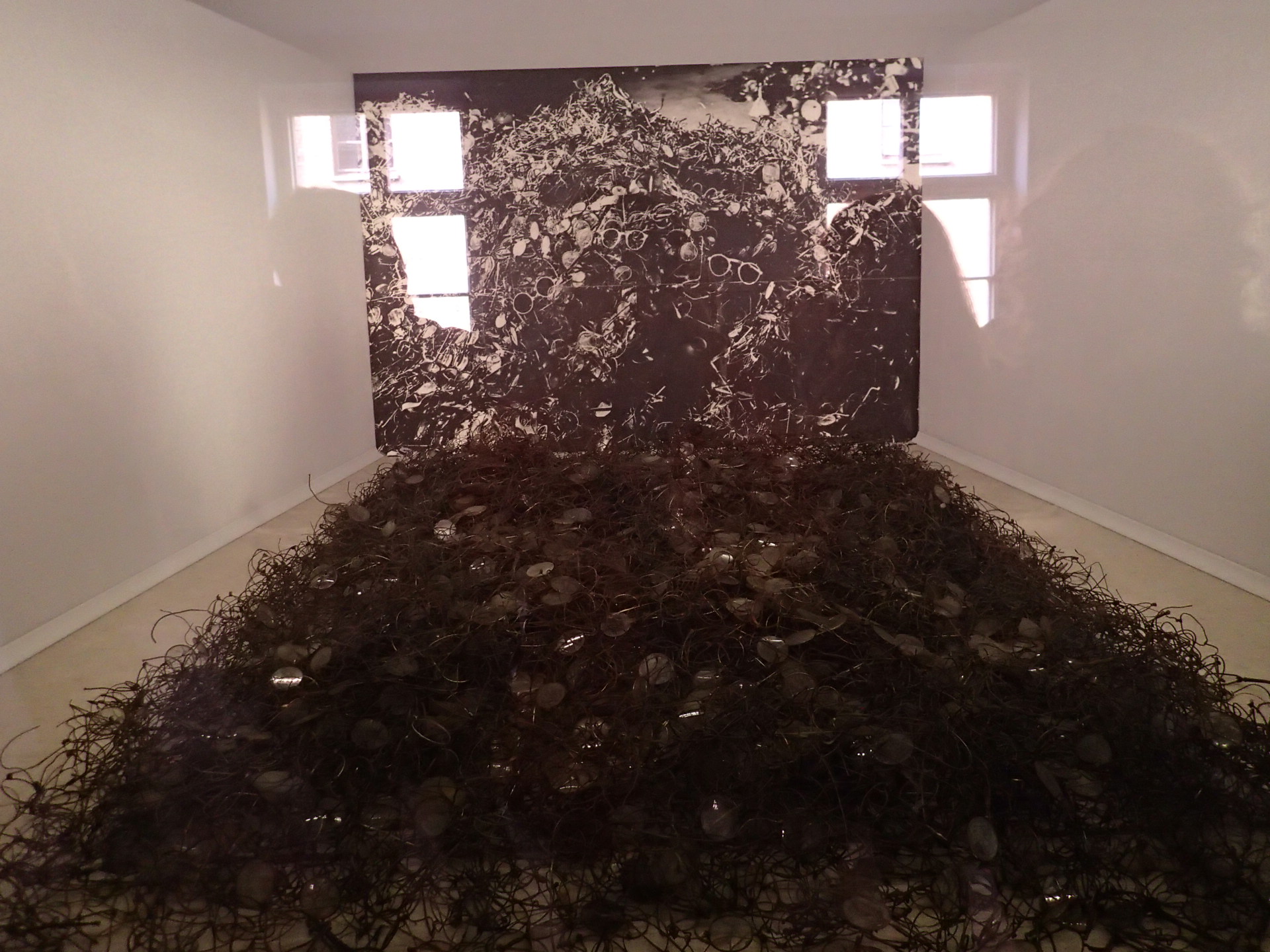 在其中一個展示空間裡,堆滿著被送進集中營時,那些猶太人的鞋子、眼鏡、義肢、行李箱等,一堆堆地。其中最讓我印象深刻的是,堆積如一座小山的女生辮子。站在玻璃櫥窗前,我想起了電影《安妮日記》中的一幕,剛從擁擠的火車下到集中營的人,除了行李、戒指等值錢物都被奪去外,女生還會被強行剪去頭髮,眼前的長辮子,就是被這樣粗暴剪下的吧。畢竟頭髮是人的一部分,不同於鞋子、眼鏡那些物品。我竟覺得或許她們靈魂的一部分還在這裡,堆積如山地。我直直盯著那堆頭髮看,感到一陣過於恐怖的毛骨悚然,同時難過又加深了許多。