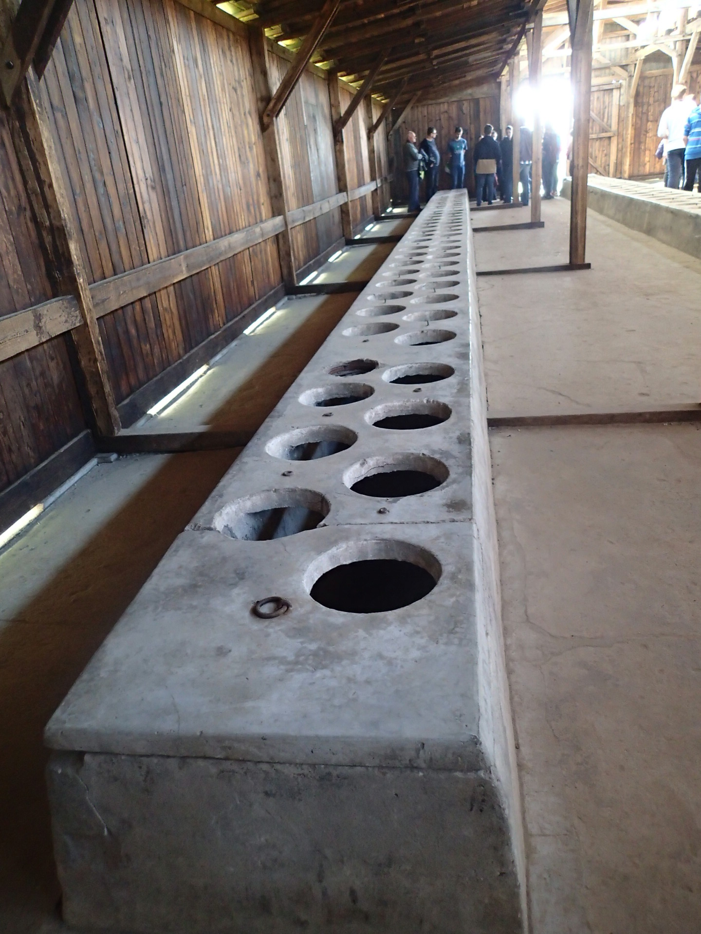一個個的洞其實就是馬桶,一個人一天會有兩次上廁所的時間,但一次只有三十秒,必須在這時間內解決大小便。集中營中人數太多,時常必須是兩個人一起擠在一個洞上。更讓現在的我無法想像的是──沒有衛生紙,所以當時牆壁和柱子上都黏滿了穢物。